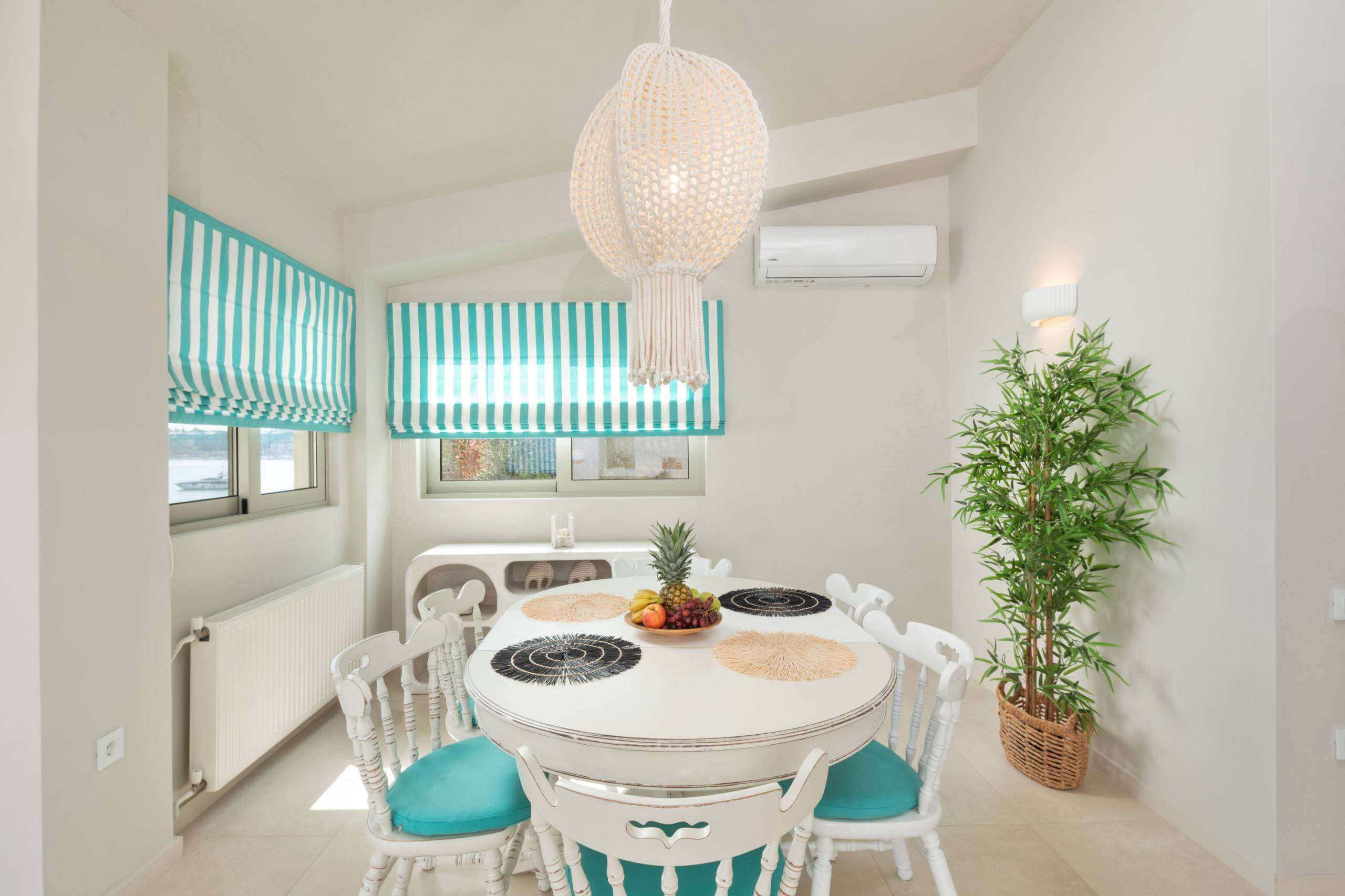Shares the same large balcony as Bedroom 2, offering a stunning sea view. Decorated in calming blue and beige colors, and equipped with a new mattress, this room provides a peaceful and relaxing athmosphere. The bathroom features a unique pebbled shower cabin, elegant black tiles, and a window, overlooking the sea, adding to the room’s luxurious ambiance.