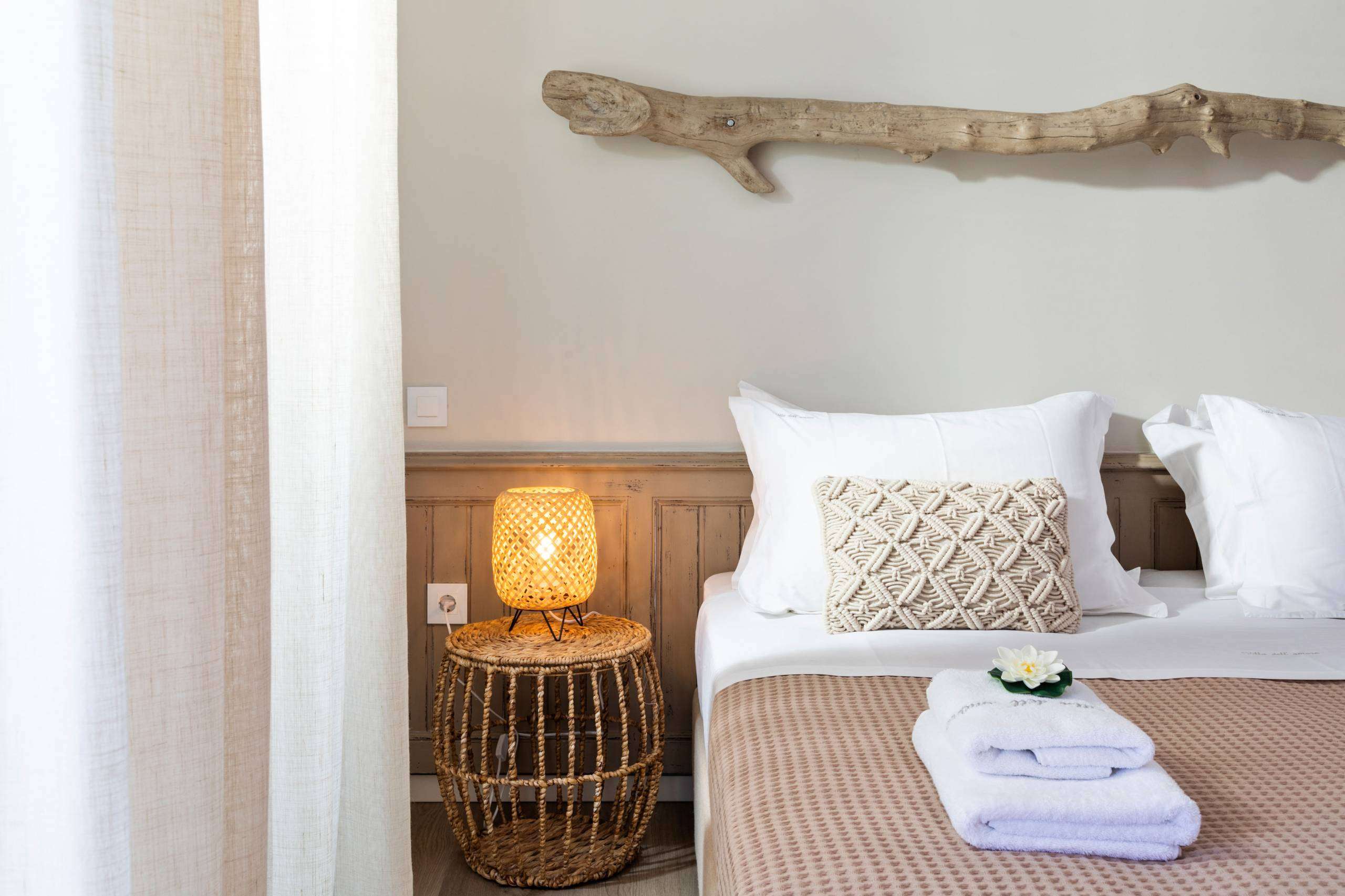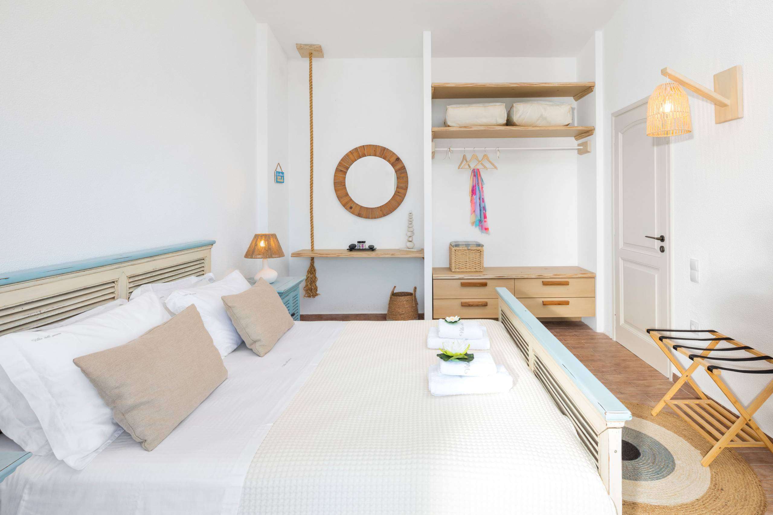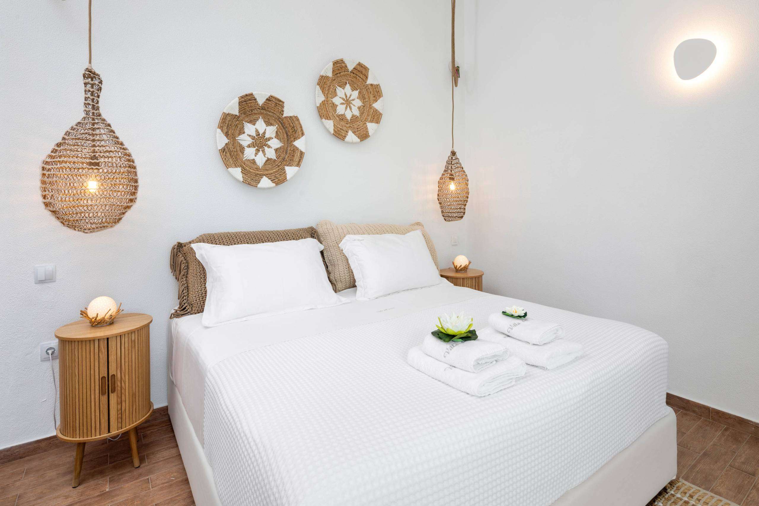 Situated on the lower floor and shares a spacious deck balcony with Bedroom 4. From the deck, guests have easy access to the pool via a short flight of stairs. The room is decorated in soothing colors and features boho furniture and lighting, creating a relaxing atmosphere. The deck itself offers cozy relaxation spots, including a hammock and a beautiful sitting area with views of the pool and the stunning sea. The bed in Bedroom 3 can be configured as either a queen bed or two single beds, providing flexible sleeping arrangements.